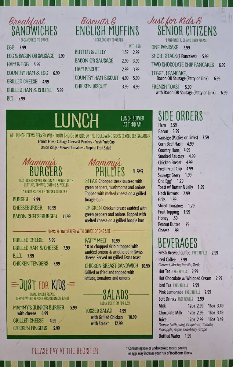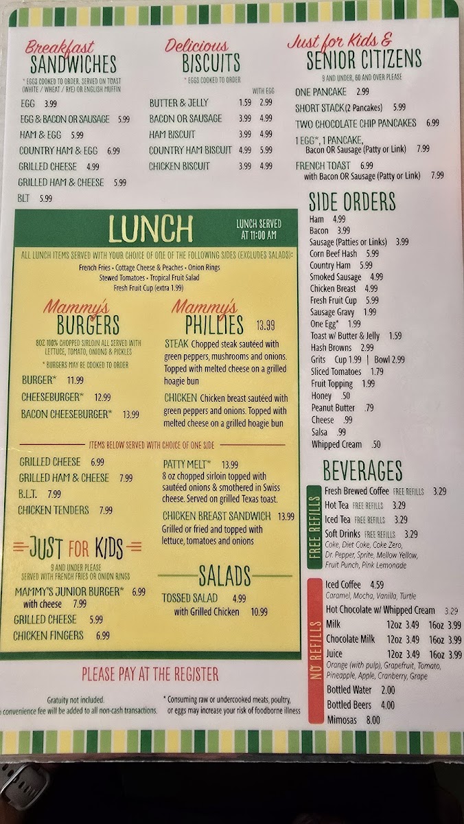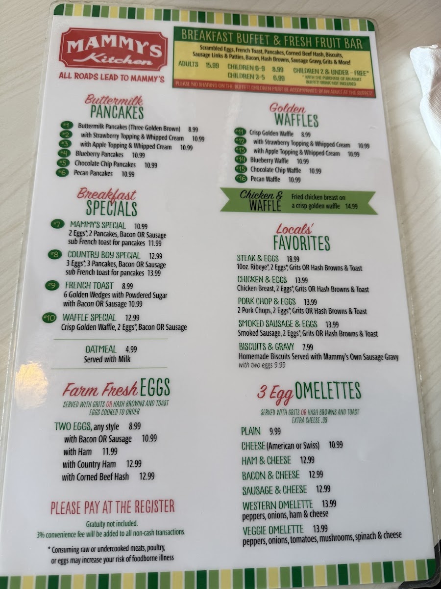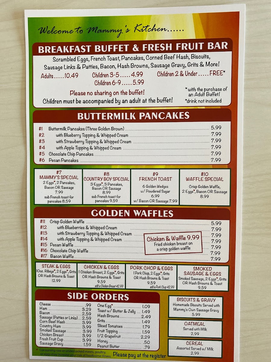 Mammy's Kitchen offers a straightforward, comforting menu that feels right at home in a casual diner setting. The focus is on hearty breakfast and brunch classics, from fresh fruit cups and biscuits smothered in sausage gravy to buffet favorites like fluffy pancakes, crispy bacon, and grits. Whether you're stopping by for an early morning breakfast, a relaxed brunch, or a midday meal, the variety ensures something familiar and satisfying for every appetite.