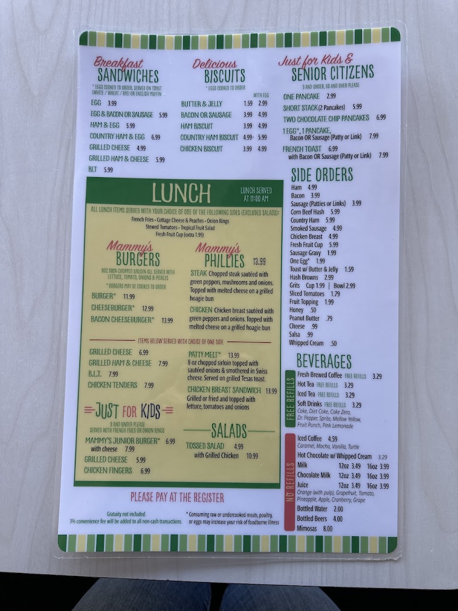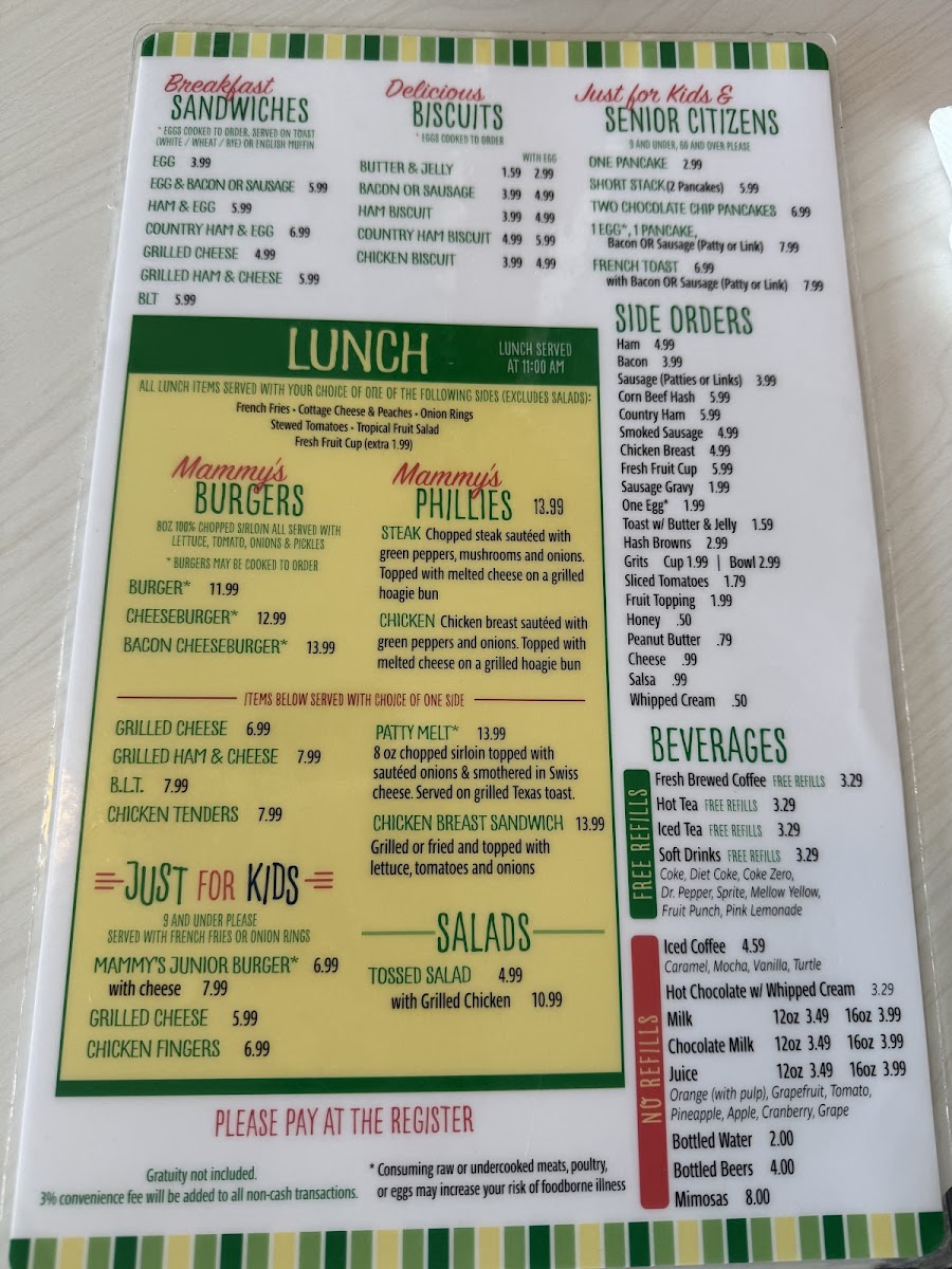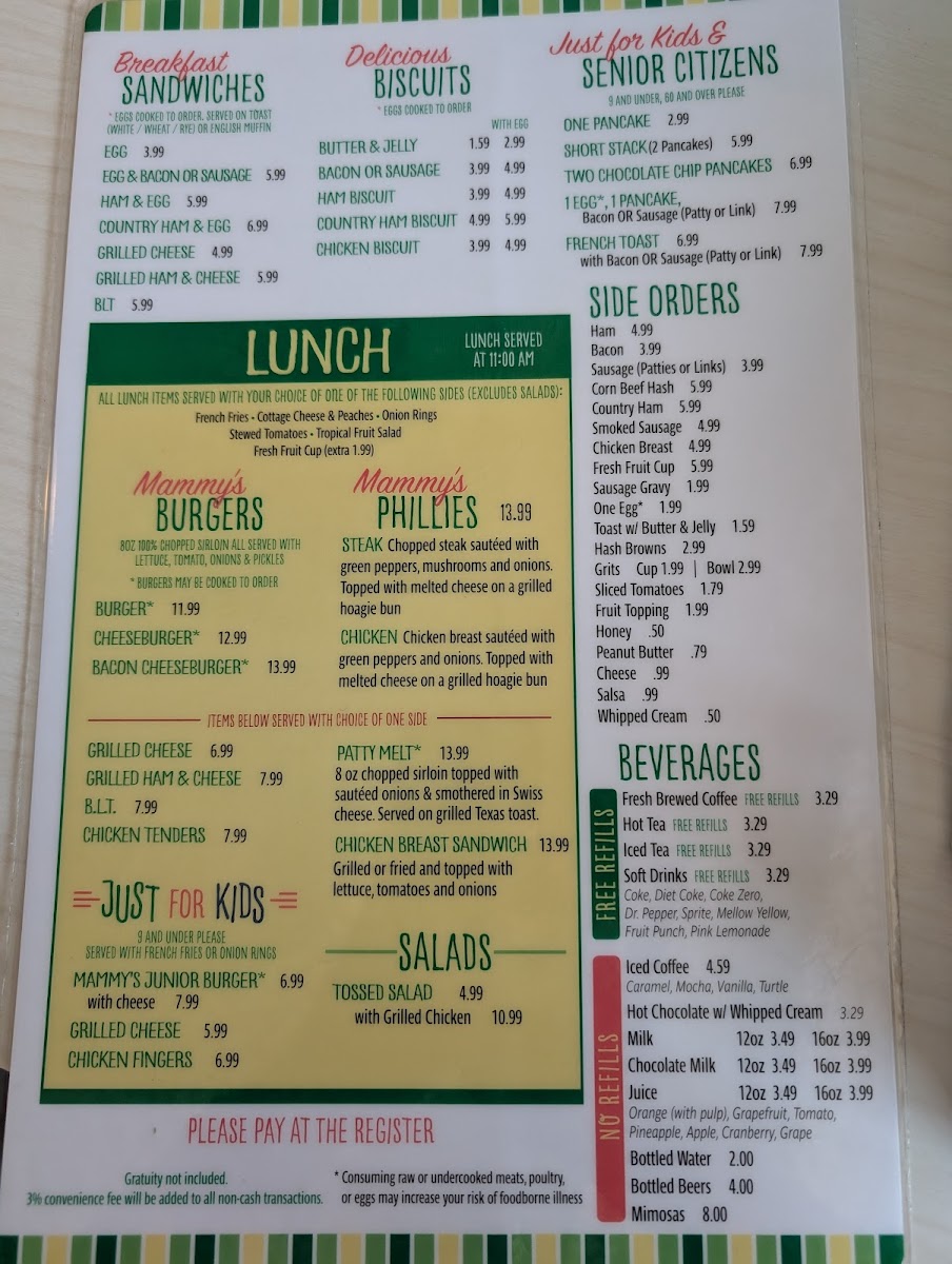 Mammy's Kitchen offers a straightforward, comforting menu that feels right at home in a casual diner setting. The focus is on hearty breakfast and brunch classics, from fresh fruit cups and biscuits smothered in sausage gravy to buffet favorites like fluffy pancakes, crispy bacon, and grits. Whether you're stopping by for an early morning breakfast, a relaxed brunch, or a midday meal, the variety ensures something familiar and satisfying for every appetite.
